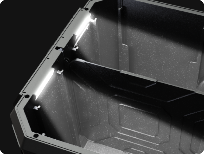 The interior lighting capabilities of the Battalion Smart Toolbox ensures you can effortlessly find what you need even in dimly lit environments and is designed to aid in the organization and customization of your tool storage, ensuring everything has a place.
